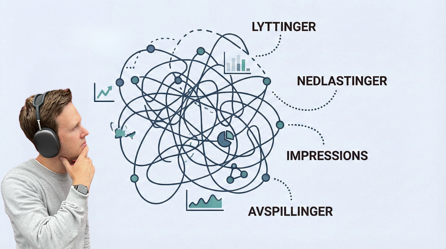 Utfordringen er at vi ikke konsekvent nok bruker de samme begrepene når vi rapporterer. Det er lett å forveksle “Unike enheter” med personer. Vi bruker også lyttinger, nedlastinger, impressions og avspillinger litt om hverandre.