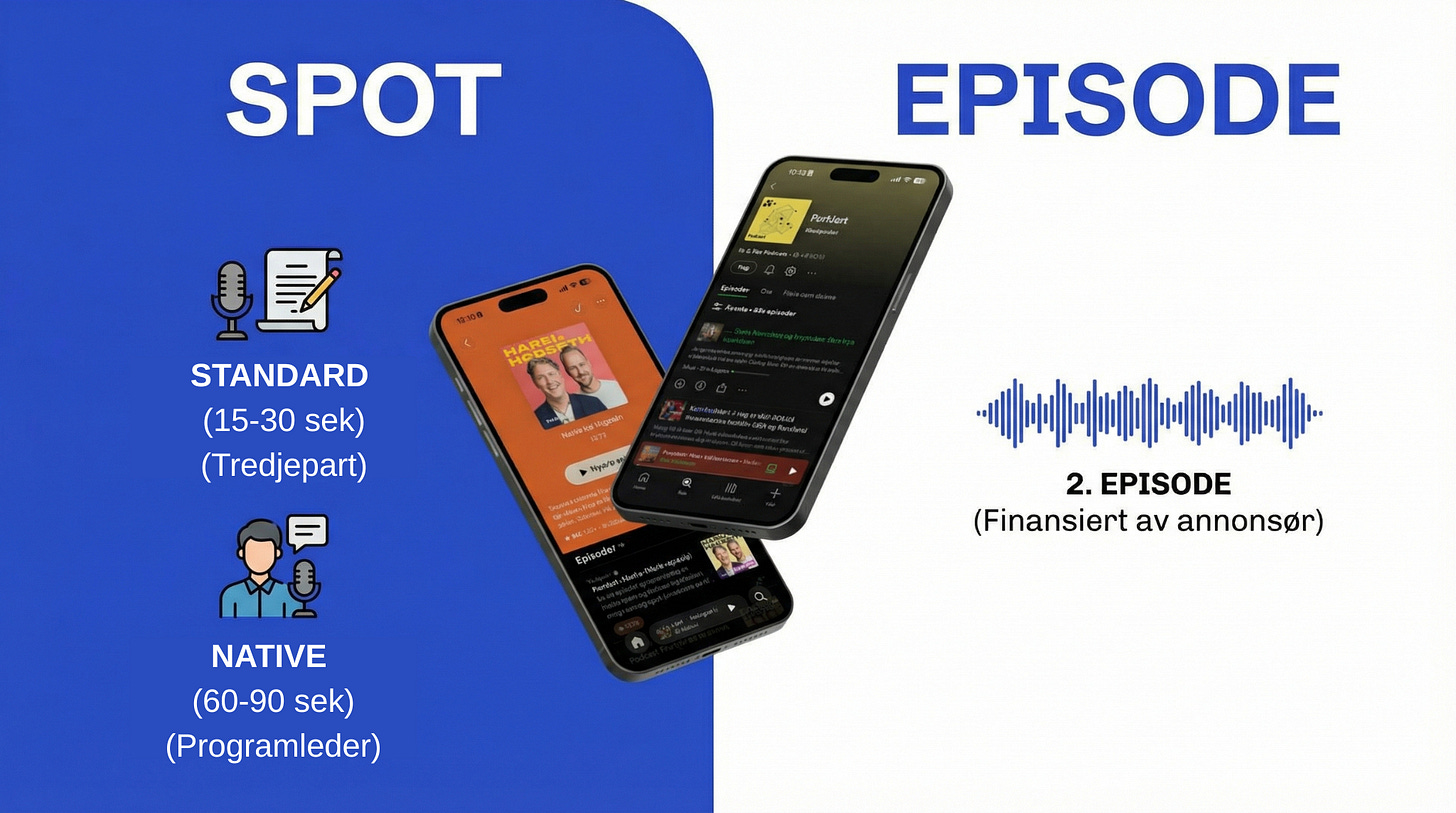 Da jeg startet å jobbe med podkast i 2015 solgte vi kun ett produkt. Vi kalte det “spons” og det innebar at podkastprofilen(e) snakket inn annonsen på sin egen måte. Her er et eksempel fra Tusvik & Tønne da de ble nominert til Gullblyanten for sitt samarbeid med Asan: