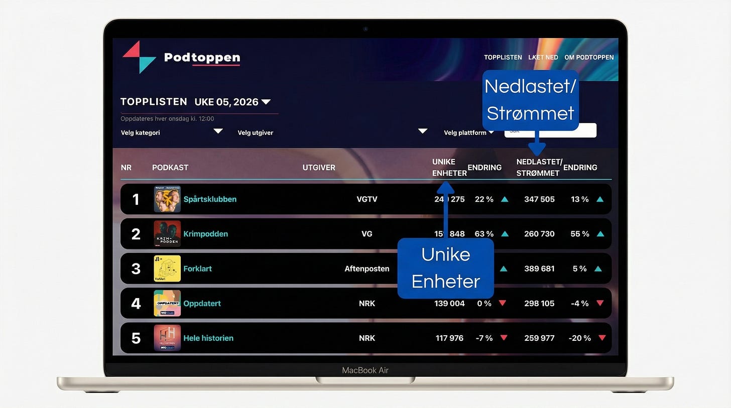 Da Podtoppen ble lansert for noen år siden ble vi enige om begrepene “Nedlastet / Strømmet” og “Unike enheter”.